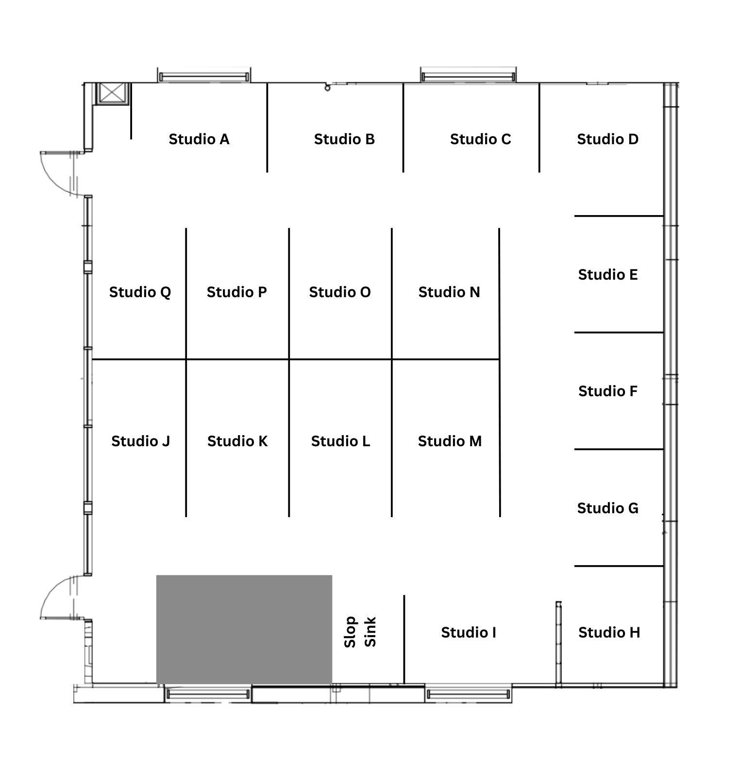 Area: 17 studios ranging approximately from 50 - 90 square feet in a shared space