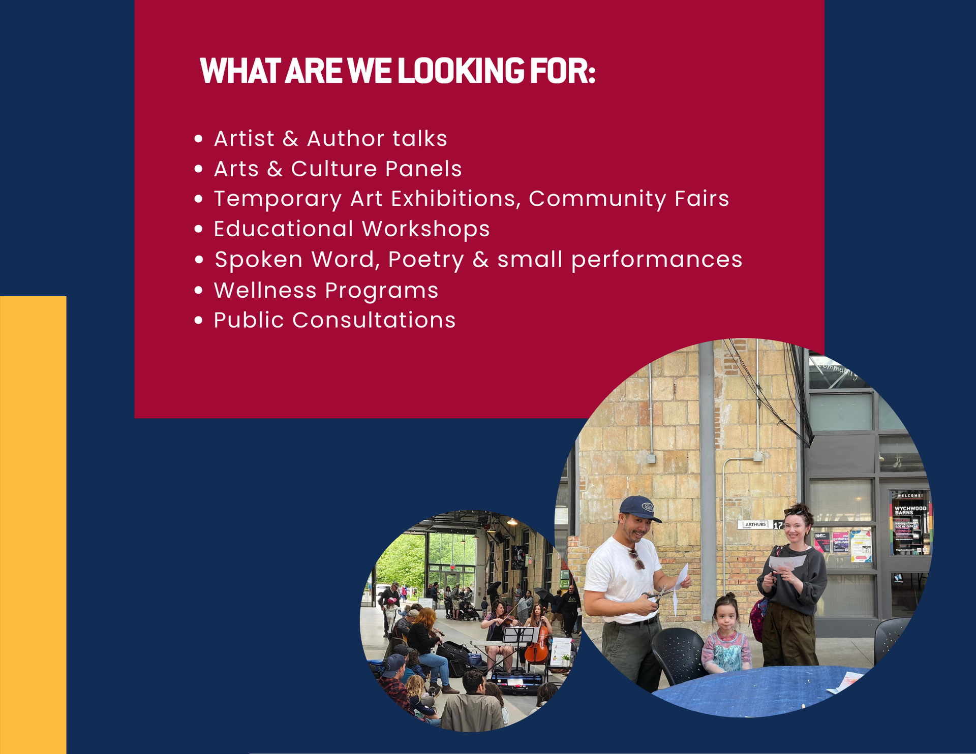 Please fill out the application form and provide as many details about your event to help us support you best. Wychwood Barns team will review the application and get in touch within the timeframe of 2 weeks. Applications will be accepted on a rolling basis until we reach program capacity or until April 1, 2026. Kindly reach out to programs@arthubs.ca for any questions!